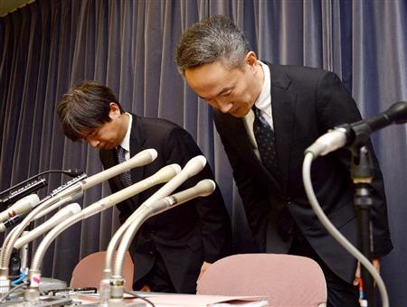 那覇空港での重大インシデントについて会見の冒頭で謝罪するピーチ・アビエーションの遠藤哲総合企画部長(右)と運航基準課の舩井康伸課長(左)=30日午前、東京都千代田区(撮影・大橋純人)【拡大】