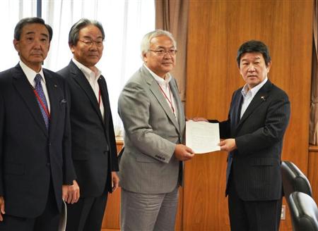 茂木敏充経産相(右)に電力コストの引き下げを求める経団連の佐々木則夫副会長(右から2人目)ら=4日、経済産業省【拡大】