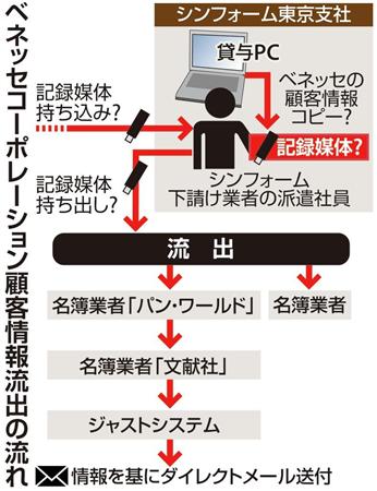 SEが共犯者の指示を受け、顧客情報を持ち出した疑いも残されている。一般的に派遣社員のSEが名簿業者との間に売買ルートを築いているとは考えにくく、捜査関係者は「ブローカーなどが介在し、高額な買い取り価格を提示してそそのかした可能性も捨てきれない」という。