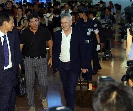 サッカー日本代表監督に就任したメキシコ出身のハビエル・アギーレ氏(55)が11日に来日し、東京都内で日本サッカー協会の大仁邦弥会長、原博実専務理事とともに就任会見に臨んだ。