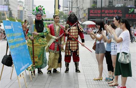 三国志の英雄、「劉備」と「関羽」「張飛」がこのほど、四川省成都市の繁華街に姿を現し、著作権保護を訴えた。多くの市民が取り囲み、写真をとったり、賛成の署名をしていた。(中国新聞社)