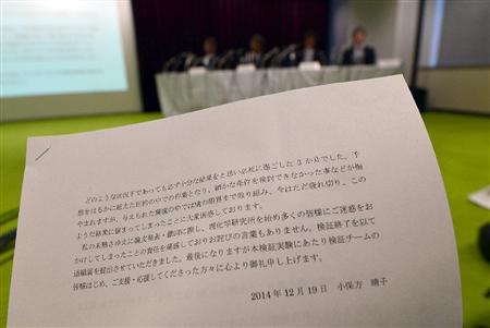 私の未熟さゆえに論文発表・撤回に際し、理化学研究所をはじめ多くの皆様にご迷惑をおかけしてしまったことの責任を痛感しておりおわびの言葉もありません。検証終了をもって退職願を提出させていただきました。最後になりますが本検証実験にあたり検証チームの皆さまはじめ、ご支援・応援してくださった方々に心より御礼申し上げます。