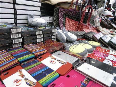 財務省の統計によると、知的財産権を侵害した物品の輸入差し止め件数はバッグ類が圧倒的に多く、14年は全体の33.9%を占めた。次いで衣類(21.0%)、携帯電話とケースなどの付属品(9.4%)、靴類(8.6%)が多かった。急増したのは携帯電話や付属品で約2倍の3331件。イヤリングや指輪などの「身辺細貨類」も2.8倍の938件となった。
