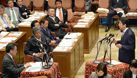 衆院平和安全特別委員会で民主党の岡田克也代表(左手前)の質問に答える安倍晋三首相。特許権の権利行使は、自衛権の発動と似ているところがある=6月26日【拡大】