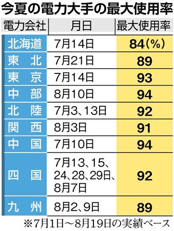 原発を持つ電力9社は7月以降、供給力に占めるピーク時の電力需要の割合を示す最大使用率が、おおむね「安定的」とされる80%台で推移。「厳しい」とされる95%を実績ベースで超えた日はない。