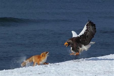 北海道の北部、遠別(えんべつ)町で農業をしながら動物の写真を撮り続けているプロカメラマン、泊和幸さん(60)が中央区銀座のギャラリーミハラヤで写真展「海ワシ物語」を、26日から11月1日まで開催。「小さなアラスカ」とたとえる地元の大自然を舞台にした動物たちの驚きの写真が紹介される。(松垣透)