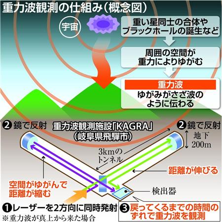 かぐらは長さ3キロのトンネルをL字形につなげた構造で、中心部からレーザーを2方向に同時に発射。重力波が届くとトンネル内の空間がゆがんで伸縮し、レーザーが鏡で反射して戻ってくるまでの時間にわずかな差が生じるのを検出する。振動が少ない地下200メートルに建設した。総工費は155億円。