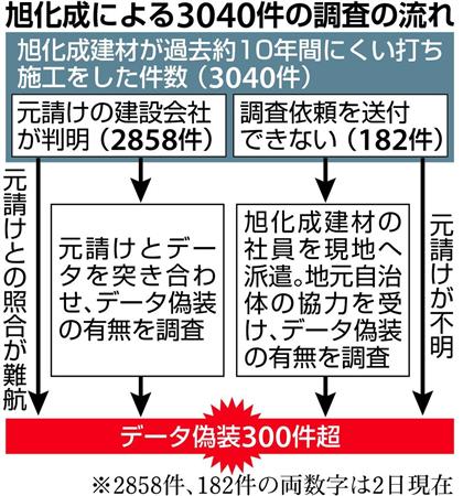 旭化成は10月22日、過去約10年間に関わったくい打ち施工が3040件だったことを国交省に報告。元請け建設会社に通知し、偽装の有無を確認していた。