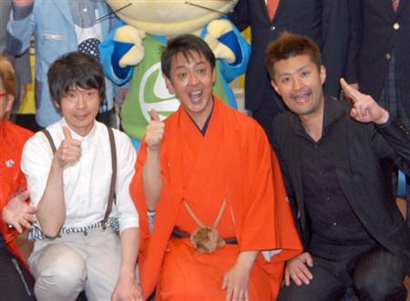 相方の長谷川瞬さん(左)、初代秋田「住みます芸人」の桂三若さん(中央)とともにポーズをとる「ちぇす」の若松弘樹さん=平成25年5月、秋田市(渡辺浩撮影)【拡大】