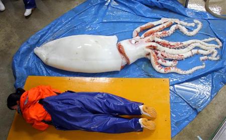 秋田県にかほ市の海岸で見つかり、男鹿市の男鹿水族館GAOに運ばれたダイオウイカの死骸。大きさが分かるよう、女性飼育員が寝そべった=14日(GAO提供)【拡大】