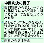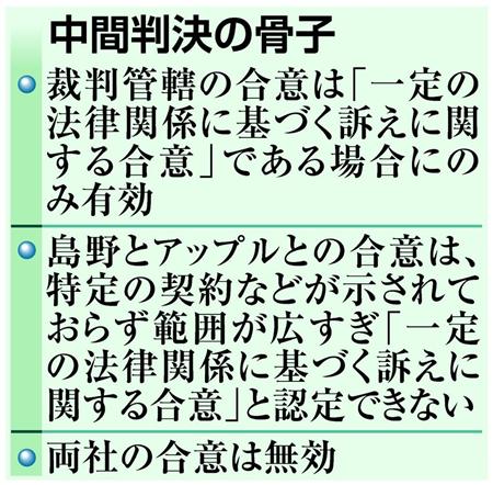 アップルは「日本での提訴は合意に反し無効」と主張。一方、島野は「合意は独占禁止法が禁じる(アップル側の)優越的地位の濫用(らんよう)の下で結ばれたため不当だ。国内で審理されるべきだ」などと反論していた。