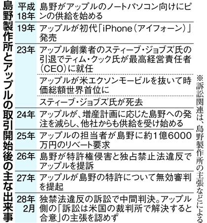 訴状などによると、島野は平成24年、電源アダプタのピンを納入していたアップルから増産要求を受け、設備投資を実施したが、直後に取引を急減させられた。取引回復を求めたが、納入価格を半額以下にするよう要求され、さらに「納入済みの在庫部品にも値下げ分を適用する。約159万ドル(約1億6千万円=当時)のリベートを支払え」と求められた。島野はいずれの要求にも従ったが、その後、「突然の取引急減や値下げ要求、リベート要求は不当だ」として提訴していた。