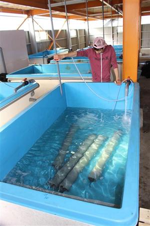 大阪湾のアナゴ漁で知られる大阪府泉南市と地元の岡田浦漁協が、稚魚から成魚にするアナゴの養殖を始めた。同市のアナゴの漁獲量は府内で最も多いが、年々減少。世界初のクロマグロの完全養殖に成功した近畿大水産研究所がアナゴ養殖のノウハウを提供する。近大が養殖し成魚となったアナゴの試食会では、「肉厚でおいしい」と市民らの評判に。関係者は養殖アナゴを泉南市の新たなブランドに育てたいと意気込んでいる。(中井美樹)