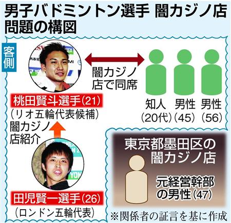 リオデジャネイロ五輪のバドミントン男子で日本代表入りが確実視される世界ランク4位の桃田賢斗選手(21)と、2012年のロンドン五輪で日本代表だった田児(たご)賢一選手(26)=ともにNTT東日本所属=が東京都墨田区の違法な闇カジノ店=平成27年3月に警視庁が摘発、閉店=に出入りしていたことが6日、分かった。この店の元経営幹部や常連客らが、産経新聞の取材に「大金で賭博をしていた」と証言。NTT東日本広報部は「両選手に確認した結果、ともに『闇カジノ店に行ったことがある』と認めた」と回答した。