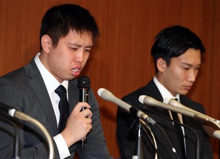 涙を流しながら謝罪会見する田児賢一選手(左)。右は桃田賢斗選手=8日、東京・大手町(撮影・小倉元司)【拡大】