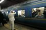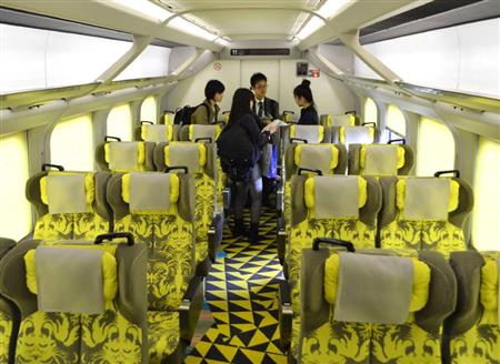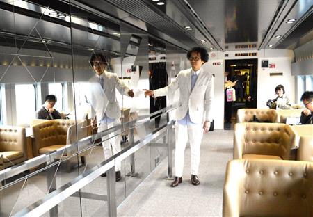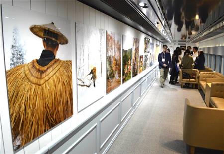JR東日本は11日、現代アートで外装や内装を装飾した「GENBI SHINKANSEN(現美新幹線)」の内部を初公開した。車内には絵画や映像などの作品が展示され、カフェスペースも設けられている。車体の側面は写真家の蜷川実花さんが撮影した花火の写真で彩られている。