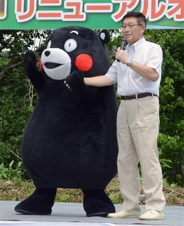 秋田県の佐竹敬久知事と握手する熊本県のPRキャラクター、くまモン=平成26年7月19日、秋田県北秋田市(渡辺浩撮影)【拡大】