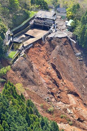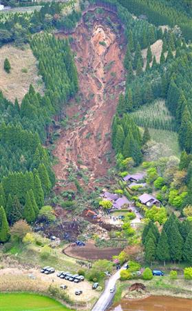 阿蘇山に近い南阿蘇村では、16日未明に起きたマグニチュード7・3の地震で、多くの土砂崩れが起きた。捜索が行われている「ログ山荘火の鳥」では2人の行方が分かっていない。山荘付近では重機とならんで、200人近くがスコップで山を削る。