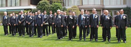 授賞式前に庭園で記念撮影をする前列左から黒川浩助・再生可能エネルギー協議会理事長、小林文彦・伊藤忠商事常務執行役員CAO、田中孝司・KDDI社長、宮下正裕・竹中工務店社長、小路明善・アサヒグループホールディングス社長兼COO、西浦三郎・ヒューリック会長、石口純輝・千葉大学環境ISO学生委員会理事長、降矢祥博・凸版印刷副社長、江島祥仁・伊藤園副会長、吉田忠裕・YKKAP会長CEO、野本弘文・東急電鉄社長=18日、東京・元赤坂の明治記念館【拡大】