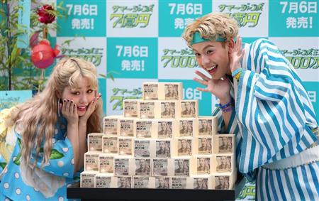 【サマージャンボ宝くじ発売開始】発売記念イベントで撮影に応じる、ぺこ(オクヒラテツコ)さんとりゅうちぇるさん=6日午前、東京・銀座(古厩正樹撮影)【拡大】