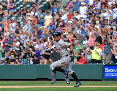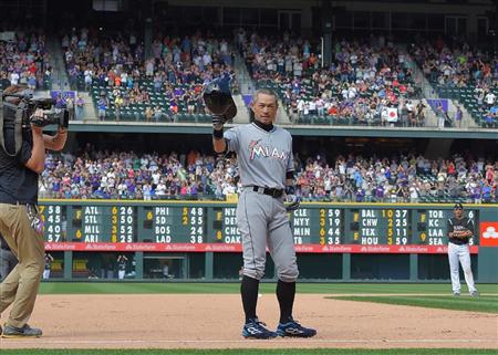 ロッキーズ戦の7回、右越え三塁打を放ち米大リーグ通算3千安打を達成したマーリンズのイチロー外野手=7日、デンバー(共同)【拡大】