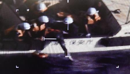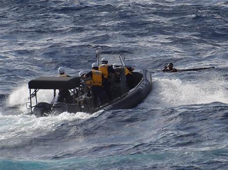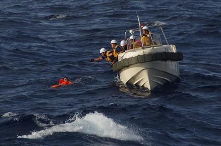 ギリシャ籍の大型貨物船と衝突し、沈没した中国漁船「ミンシンリョウ05891」の乗組員の救助に向かう海上保安庁のゴムボート=11日、沖縄県石垣市の魚釣島沖(海上保安庁提供)【拡大】