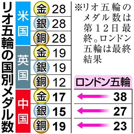 金メダル獲得数は同日現在、米国が28個、英国が19個、中国は17個。米英は日程を消化するごとに、ロンドン大会とほぼ同じペースで獲得しているが、中国は約半分のペース。北京大会では参加国の中で最多の51個、ロンドン大会でも米国に次ぐ38個の「金」を獲得した中国にしては、あまりにスローペースといえる。