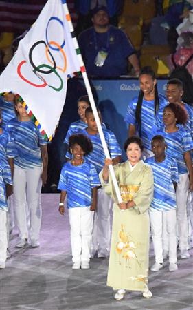 リオ五輪閉会式で21日午後9時45分(日本時間22日午前9時45分)ごろ、「フラッグハンドオーバーセレモニー(五輪旗の引き継ぎ式)」が始まり、五輪旗がリオ市のエドゥアルド・パエス市長から、国際オリンピック委員会(IOC)のトーマス・バッハ会長を経て、2020年の五輪開催都市である東京都の小池百合子都知事に手渡された。小池知事は笑顔で旗を振り、次期開催都市をアピールした。(五輪速報班)