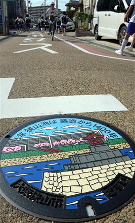 築造1400年を迎えた「狭山池」を題材にした大阪狭山市のマンホールのふた。こんなマンホールが道路のいたるところにあれば楽しそう【拡大】