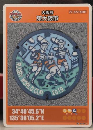 例えば、平成31年のラグビーワールドカップの試合会場である大阪府東大阪市のカードでは、ラガー3人が勇壮に駆ける姿が描かれている。マンホールといえば無機質な鉄板というイメージしか浮かばないが、もしこんなマンホールを見かけたなら必ず足を止めてしまいそう。実際に東大阪市内には3カ所で使用されているという。