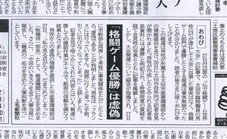 群馬県太田市の臨時職員の男性(23)が、20日と21日に仏パリで開催されたとするゲームの国際大会の格闘ゲーム部門で優勝したとして記者会見を開いた内容が虚偽だったことが28日、分かった。記者会見を受け、朝日新聞と、群馬県の地方紙の上毛新聞は記事を掲載しており、2紙は28日付で訂正記事を載せ、おわびした。