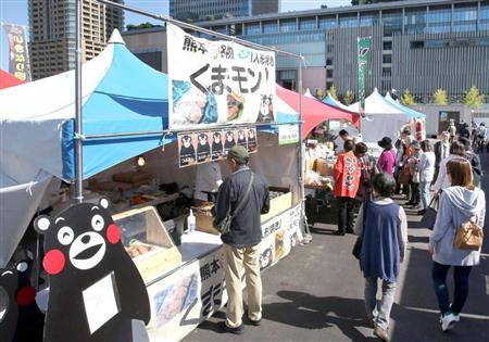 阿蘇山ふもとの西原村で「黒糖ジャンボ芋かりんとう」などを販売する「旬香(しゅんか)」の光瀬康弘社長(60)は「復興は道半ば。全国からたくさんのボランティアに来ていただいたが、今度は阿蘇に観光に来てほしい」と話していた。29、30日には熊本の米焼酎も並ぶ。