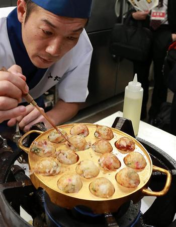 純金製たこ焼き器は大阪の食文化になじみ深い製品として企画。重さ約3キロ、直径約21センチで、実際に調理で利用できる。金のようじも用意した。
