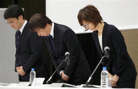 会見の最後に改めて謝罪するDeNA幹部。南場智子会長(右)、守安功社長(中)ら=7日午後、東京都渋谷区(桐山弘太撮影)【拡大】