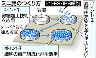 国立成育医療研究センター(東京都)や東北大などの研究グループが、ヒトの人工多能性幹細胞(iPS細胞)や胚性幹細胞(ES細胞)を使って、約1センチの立体的な腸(ミニ腸)をつくることに世界で初めて成功したと、12日付の米科学誌「JCIインサイト」で発表した。難病の治療や創薬の開発につながり、将来的には移植治療への応用も目指しているという。