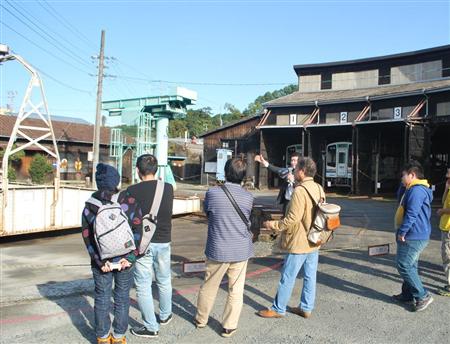 • 転車台見学ツアーで係員の説明を聞く参加者