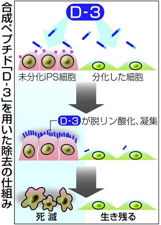 チームによると、アミノ酸が複数つながった合成ペプチドの「D-3」は、iPS細胞の表面にある酵素に反応すると脱リン酸化し、iPS細胞に集まって死滅させる毒性を生じる特徴がある。