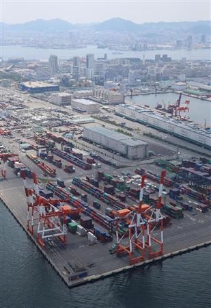 強い毒を持つ「ヒアリ」が見つかったポートアイランドにある神戸港のコンテナヤード(手前)=18日午後1時45分、神戸市中央区(本社ヘリから、恵守乾撮影)【拡大】