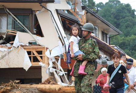 倒壊した家屋を背に、自衛隊員に抱きかかえられながら避難する女児=6日午後0時45分、福岡県朝倉市(恵守乾撮影)【拡大】