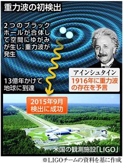 重力波は重い天体同士が合体するなどした際、その重力の影響で周囲の空間にゆがみが生じ、波紋のように遠くまで光速で伝わっていく現象。アインシュタインが1916年、重力と時空に関する一般相対性理論でその存在を予言した。