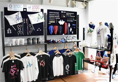 2020年東京五輪・パラリンピック組織委員会は18日、東京・原宿の公式ライセンス商品ショールームで、五輪開幕千日前の28日に合わせて発売するTシャツやピンバッジを発表した。展示コーナーには「1000 days to go!」の文字が入った記念商品が並んだ。