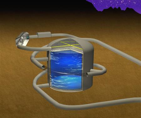 ハイパーカミオカンデは、地下650メートルに掘った巨大な円筒形の水槽を19万トンの水で満たす構造。飛んできたニュートリノが水と反応して発する光を壁に取り付けた4万個のセンサーで捉える。