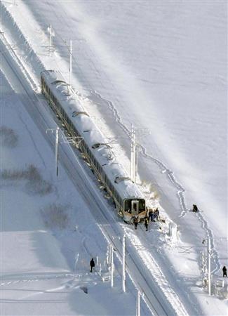電車は新潟発長岡行きで、11日午後6時55分ごろ、信越線東光寺駅から帯織駅方向に約300メートルの地点で動けなくなった。社員が人力で除雪を続けたが降雪が多く間に合わず、除雪車の出動も遅れたことから、運転再開は12日午前10時半ごろになった。