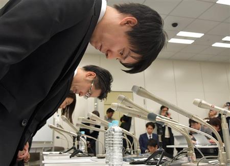 会見冒頭、謝罪するコインチェックの和田晃一良社長(手前)と大塚雄介COO(中央)=26日深夜、東京都中央区(佐藤徳昭撮影)【拡大】