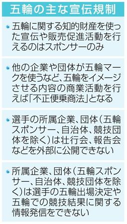JOCなどによると、五輪の名称や標章は契約金を払ったスポンサーしか使用できない。五輪の知的財産を保護するためで、スポンサー以外の企業や団体は所属選手の五輪での成績公表すら許されていない。