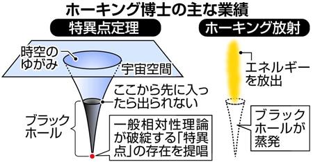 74年には「ホーキング放射」と呼ばれる理論を提唱。ブラックホールは非常に強い重力を持ち、あらゆる物をのみ込むと考えられているが、周囲にのみ込む物がない状態では、逆にエネルギーを放出して蒸発するという仮説だ。