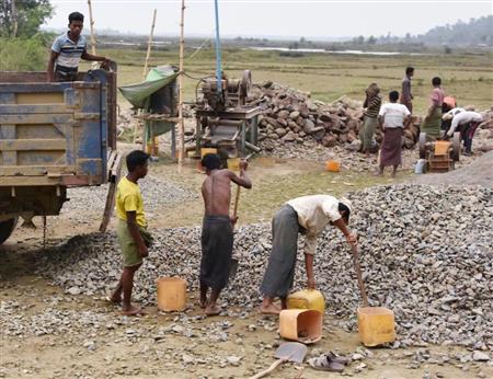 ミャンマー西部ラカイン州で、土木作業に従事する人たち=3月17日(共同)【拡大】