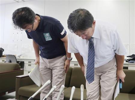校外学習後に1年生の男児が死亡し、記者会見で頭を下げる愛知県豊田市立梅坪小の籔下隆校長(右)ら=17日午後、豊田市役所【拡大】