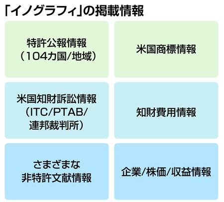 イノグラフィは、知財情報(特許、商標などの公報データなど)と非知財情報(企業、収益、株価、訴訟、その他文献情報など)を1つのソフトウエア画面上で同時に表示し、検索から解析までを可能にした点に特徴があり、知財部門はもとより全社横断的に活用できる。