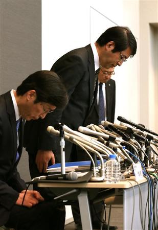会見で謝罪、頭を下げる笹井芳樹・理化学研究所発生・再生科学総合研究センター副センター長(中央)=16日午後、東京都千代田区(小野淳一撮影)